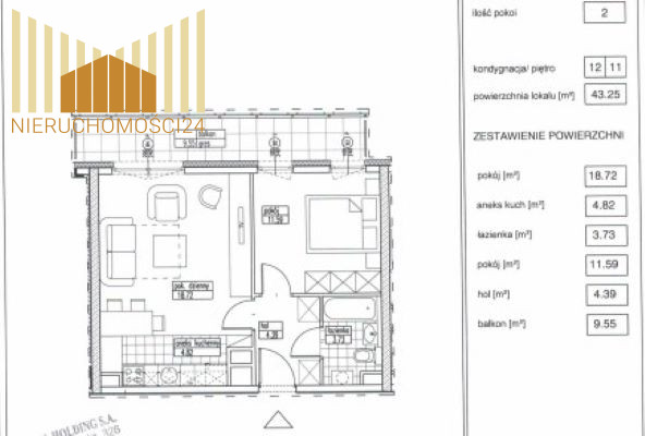 Składa się z: salonu (18,72m2) z aneksem kuchennym (4,82m2), sypialni (11,59m2), łazienki (3,73m2), holu (4,39m2).