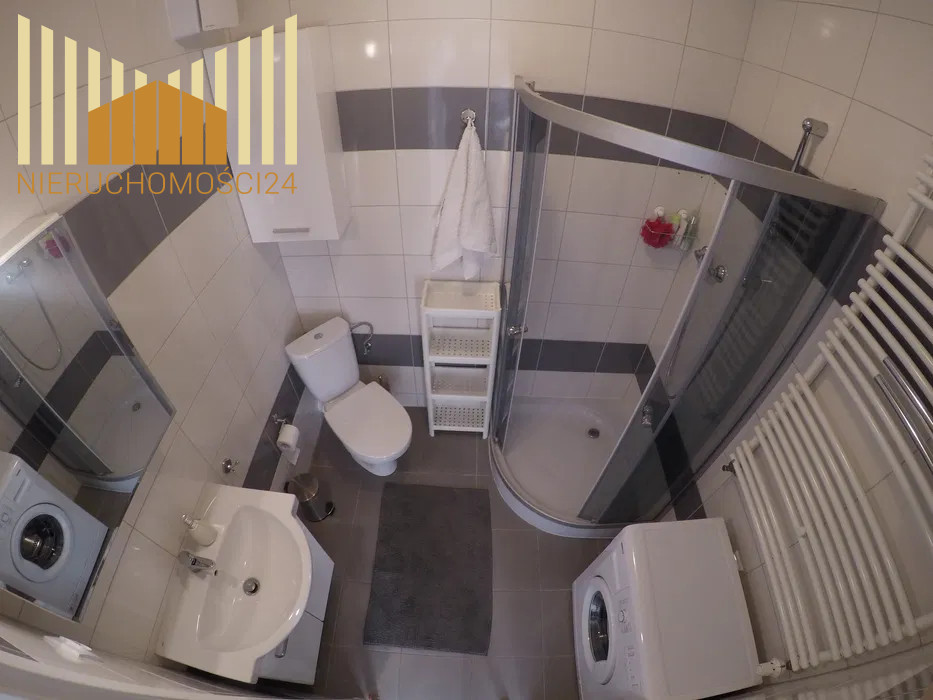 - w łazience pralka i szafki oraz nowa kabina prysznicowa,