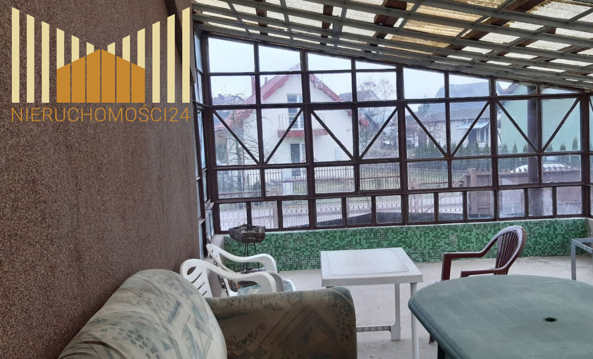 Dodatkowo garaż , nad którym znajduje się zadaszony taras .