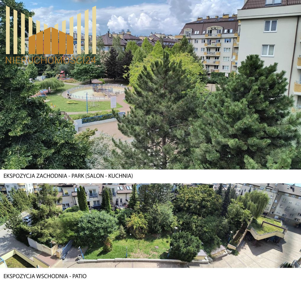 • Część zachodnia: widok z kuchni i salonu na cichy, zielony park z oczkiem wodnym i placem zabaw