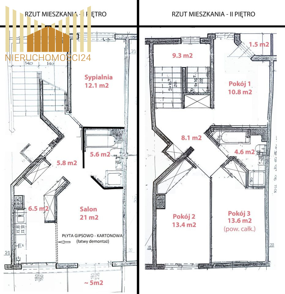 DÓŁ (51 m²)• Salon (21 m2) z kuchnią (6.5 m2) aktualnie oddzielone płytą gipsowo - kartonową (łatwy demontaż)